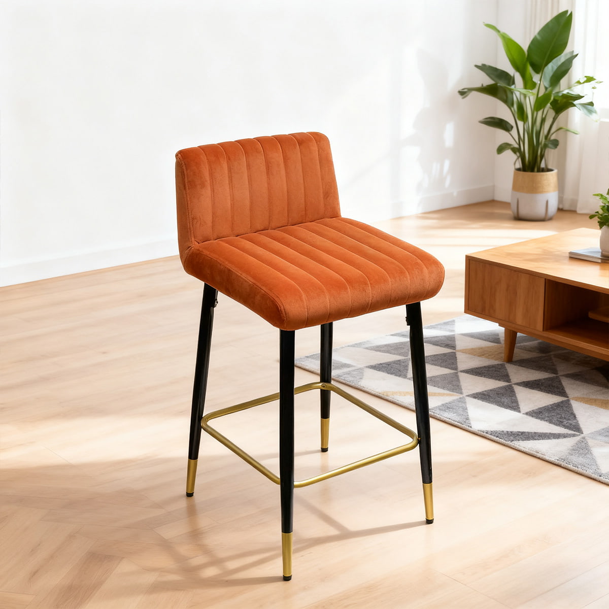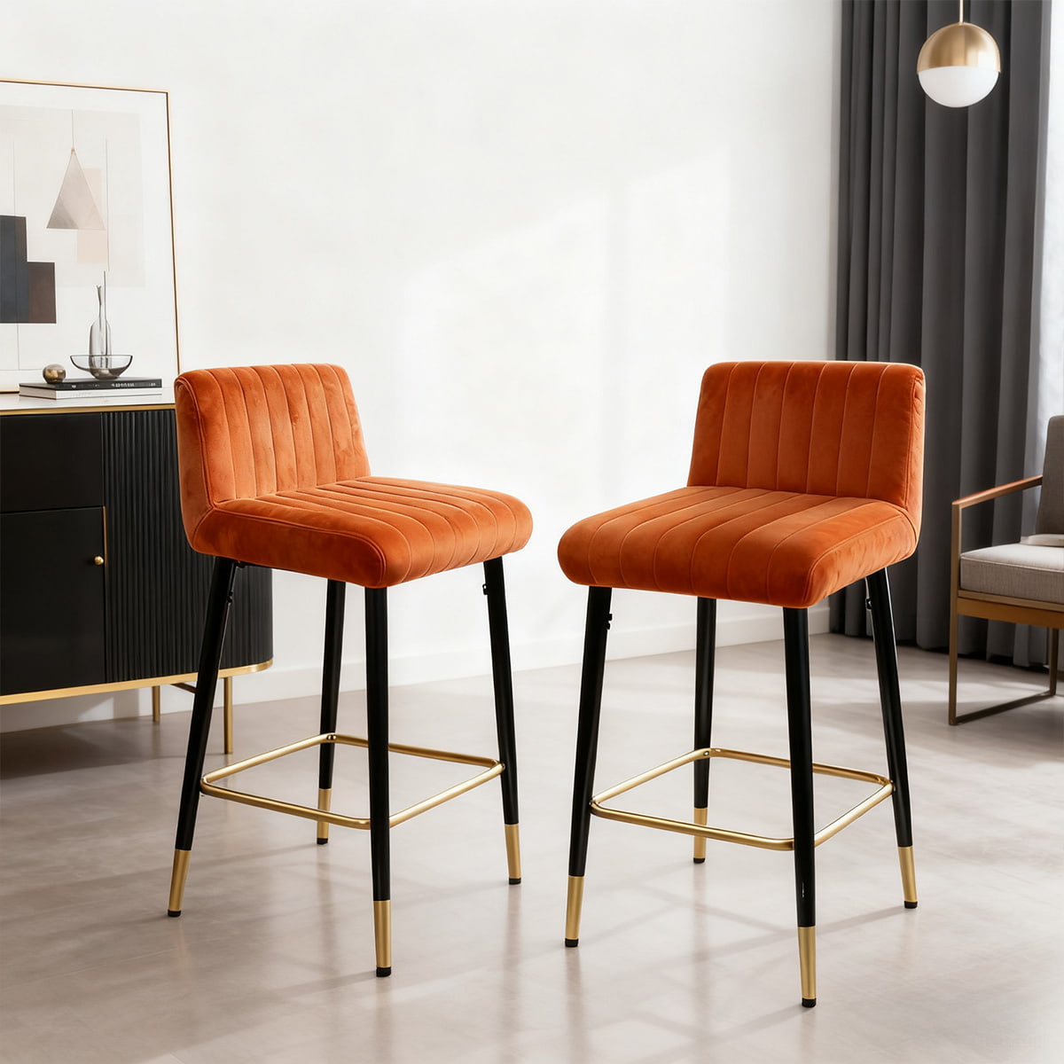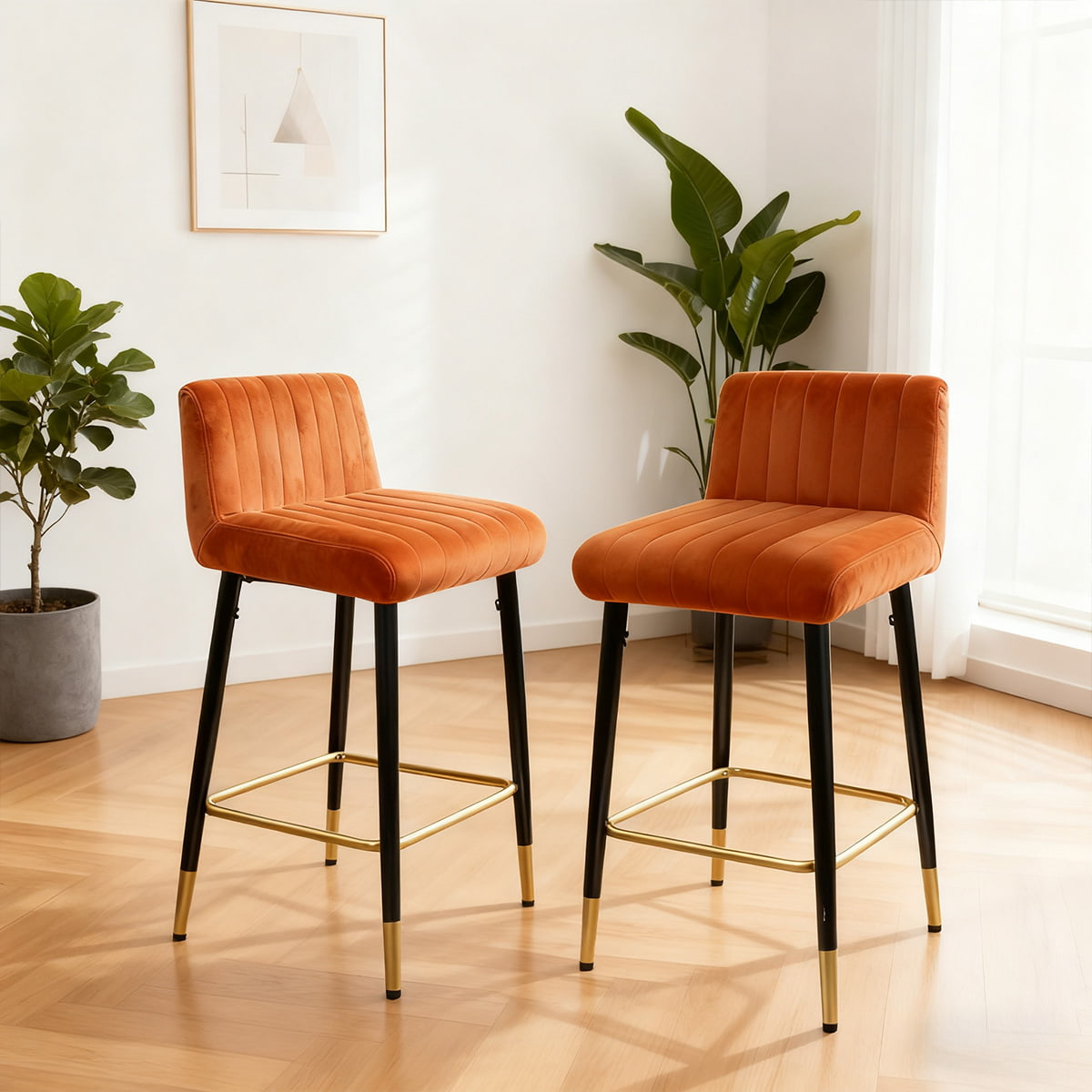 Modern Ochre Orange Velvet Barpall — 360° vridbar mothöjd stol med svarta och guldiga metallben, mjukt stoppad sits och fotstöd för köksö, bar eller matsal