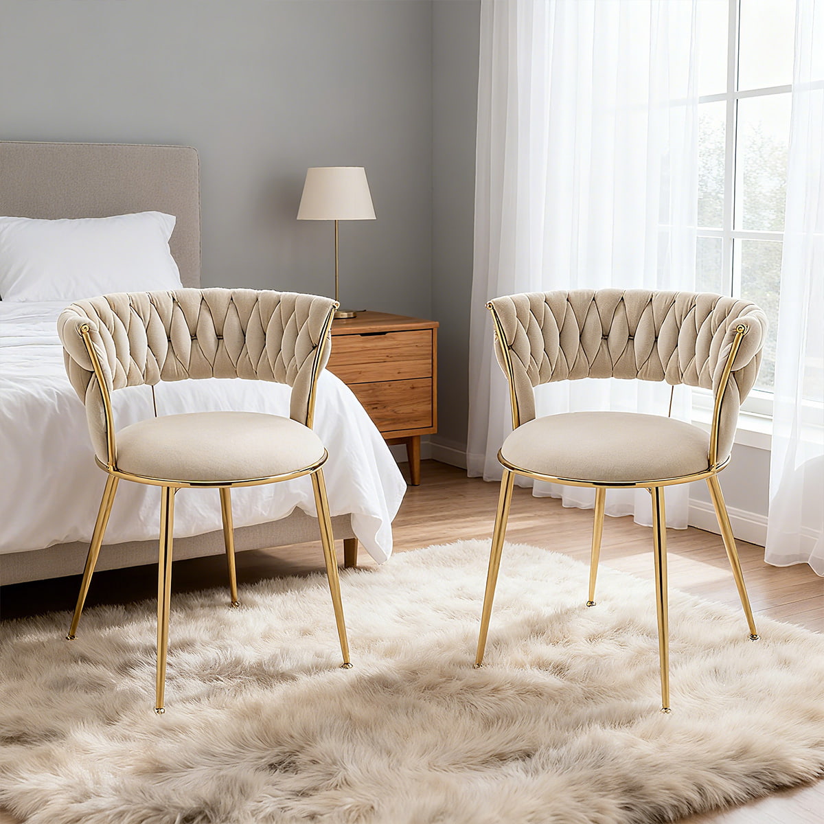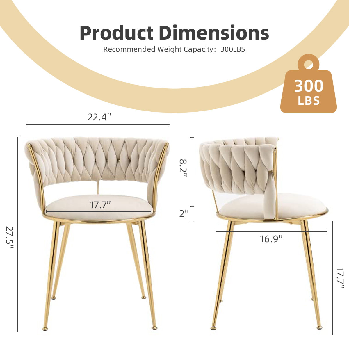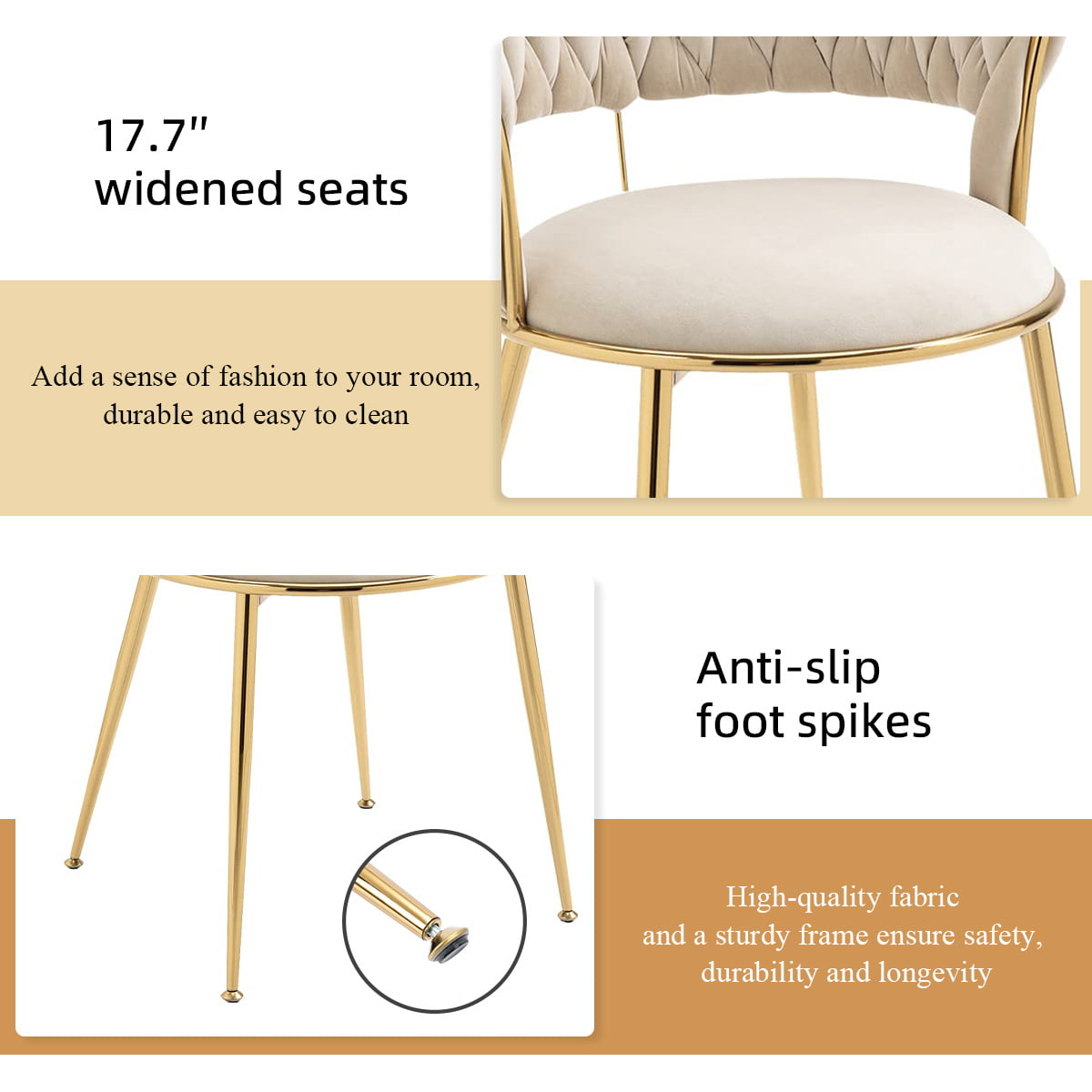 Modern matsalsstol i sammet i elfenben med vävt ryggstöd och guldmetallben – elegant stoppad accentstol för matsal, kök eller vardagsrum