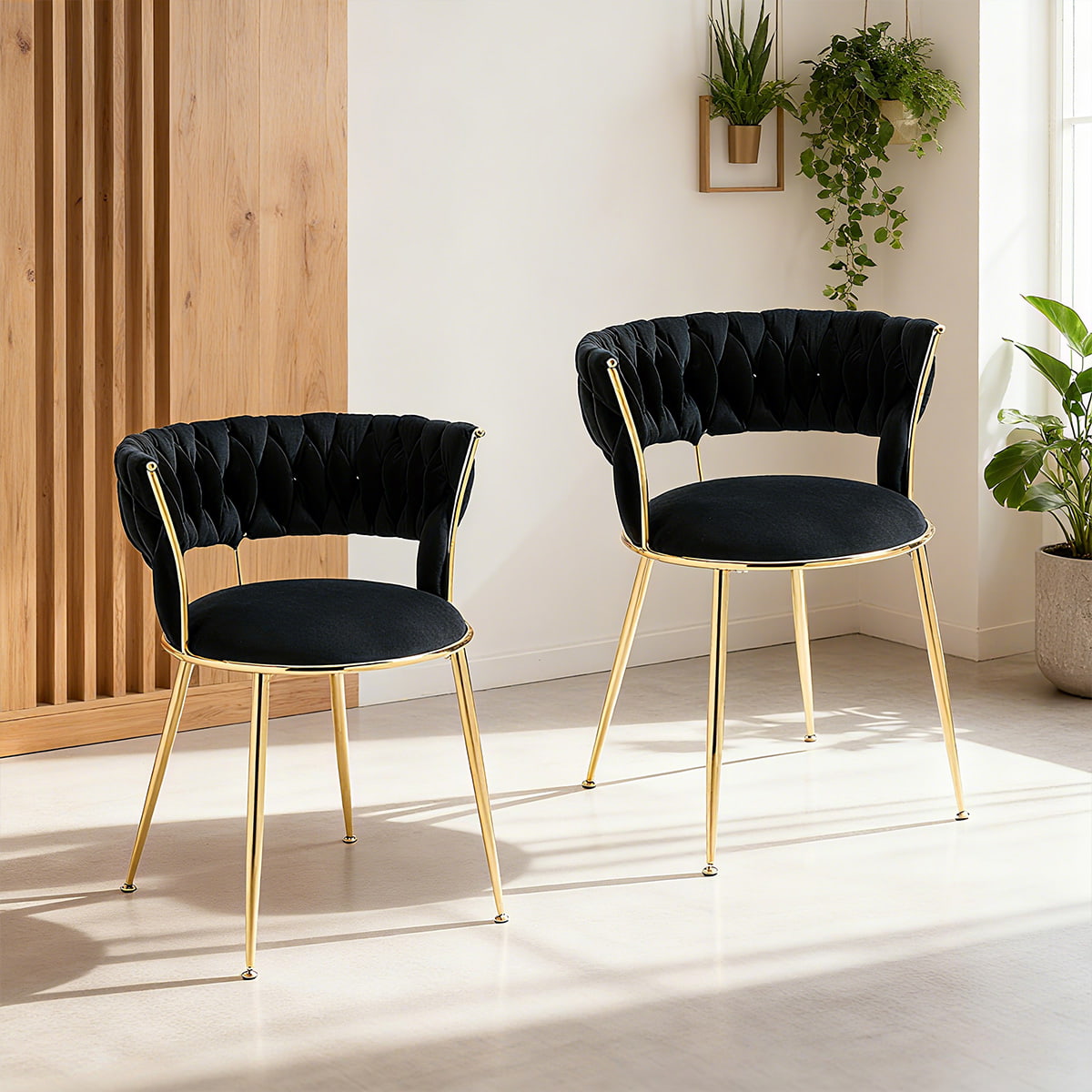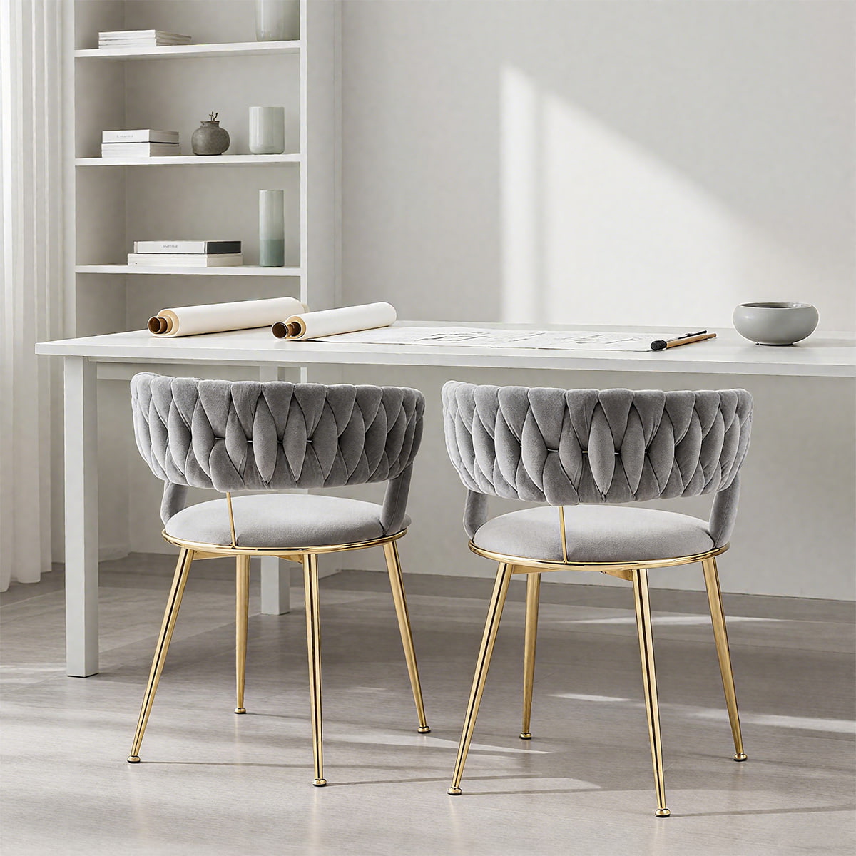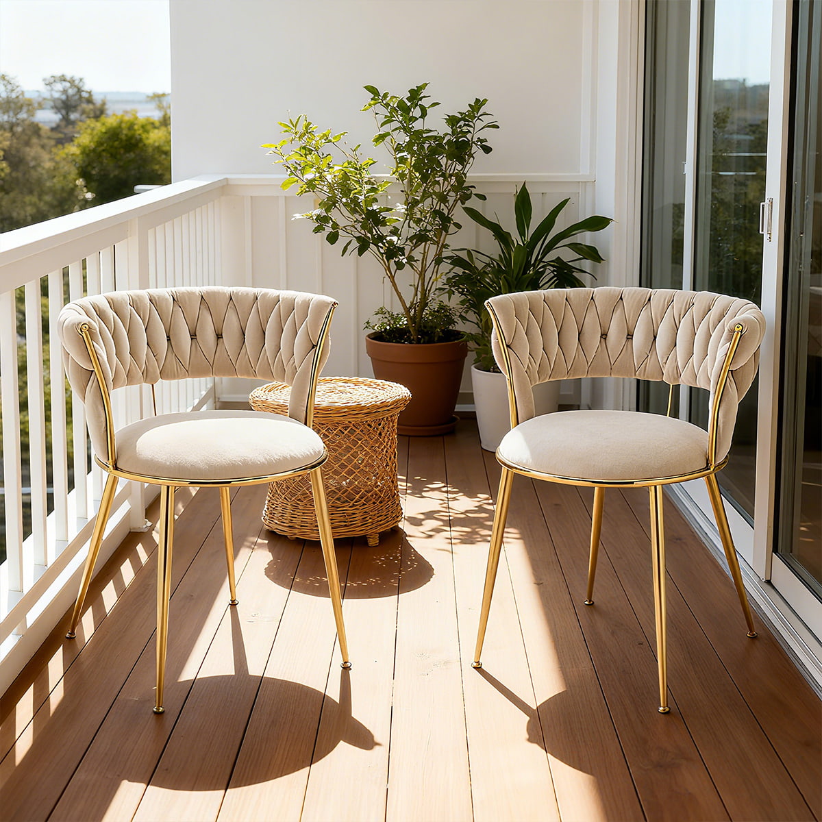 Modern matsalsstol i sammet i elfenben med vävt ryggstöd och guldmetallben – elegant stoppad accentstol för matsal, kök eller vardagsrum