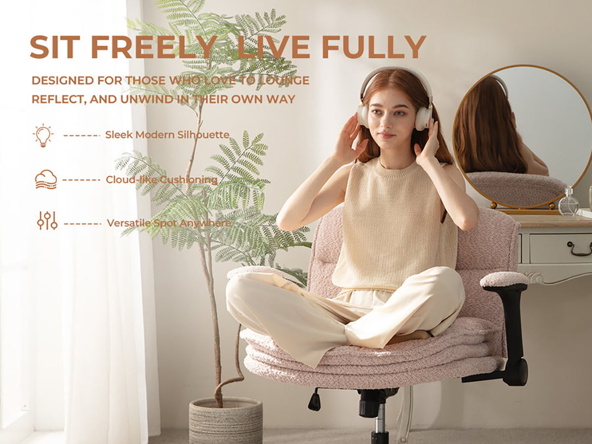 Uppfällbara armstöd maximerar flexibiliteten – sitt lätt med benen i kors, i sidled, upprullade eller upprätt. Denna stol är byggd för komfort, rörelse och stil, perfekt lämpad för hemmakontor, sovrum och kreativa utrymmen.
