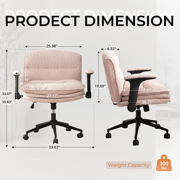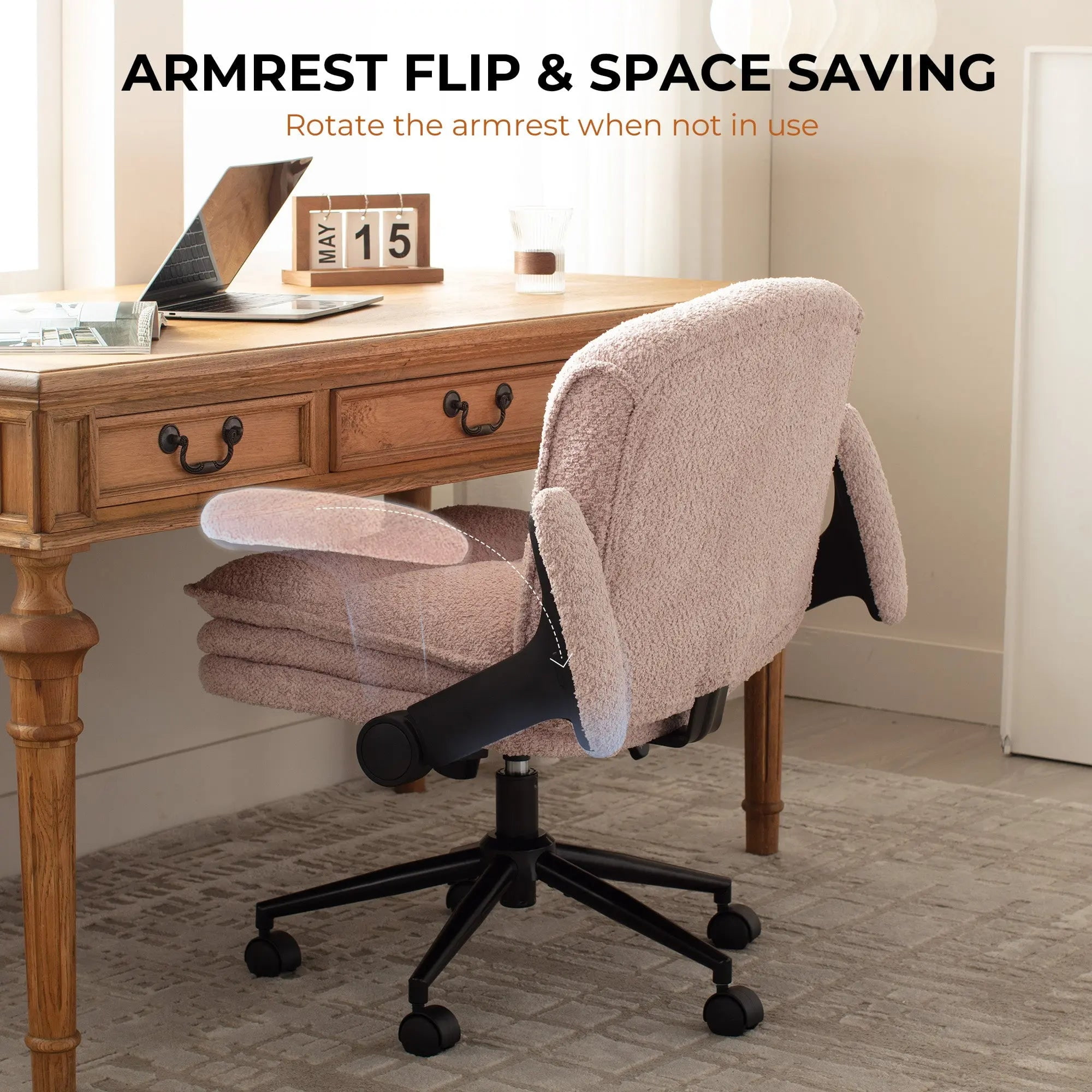 ① Criss Cross kontorsstol med uppfällbara armar och 3-lagers kudde — Ergonomisk Bouclé-skrivbordsstol med bred sits och hjul