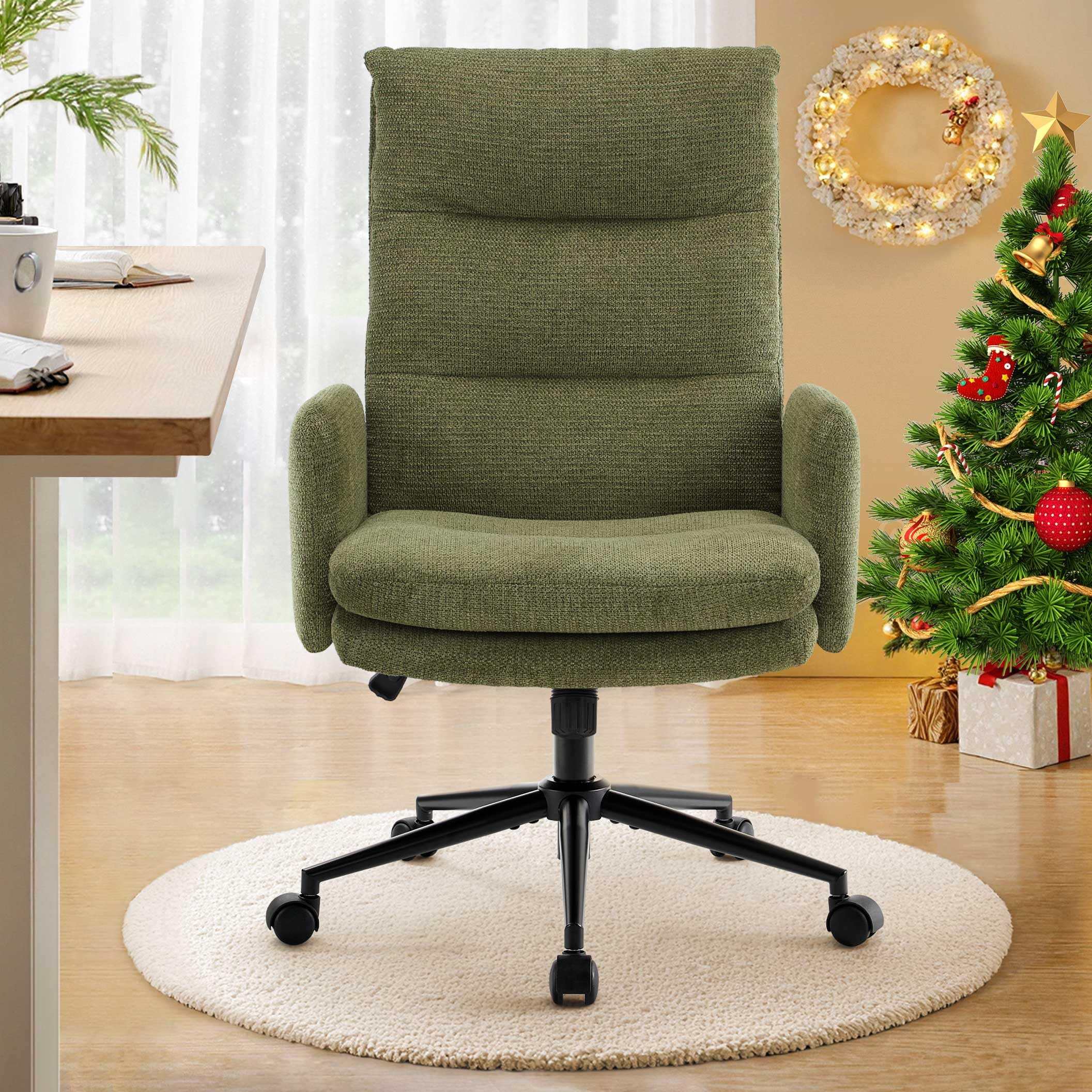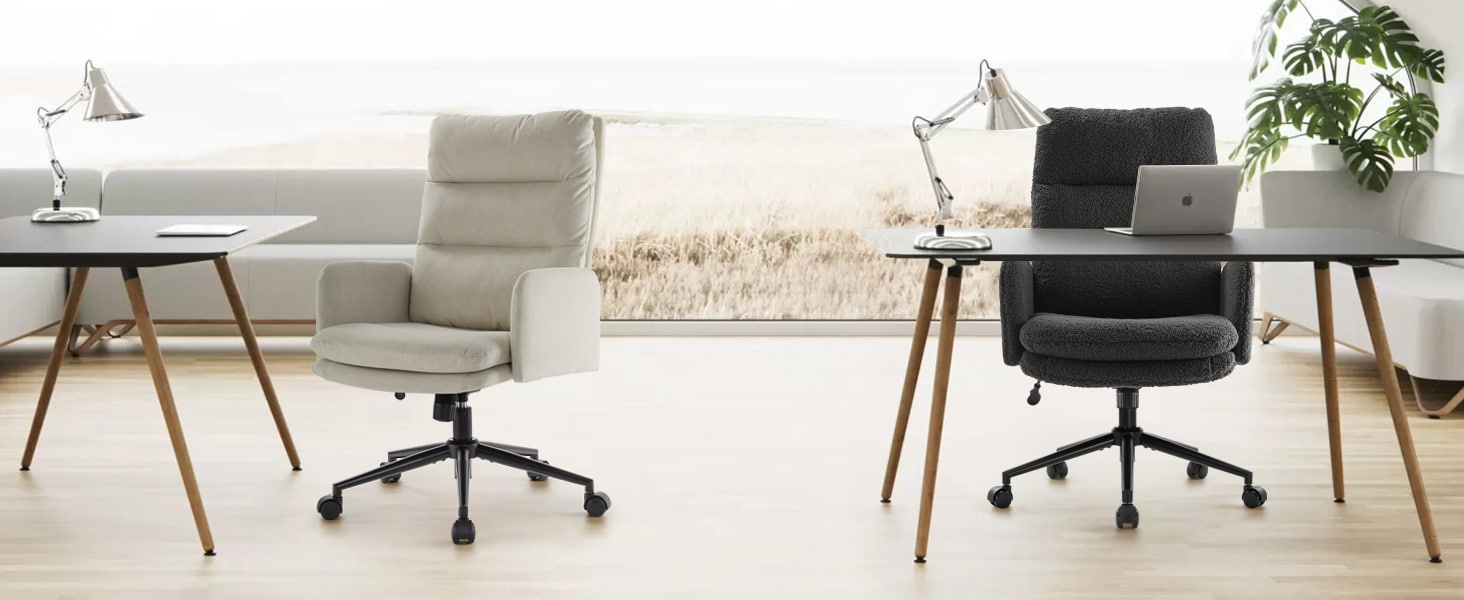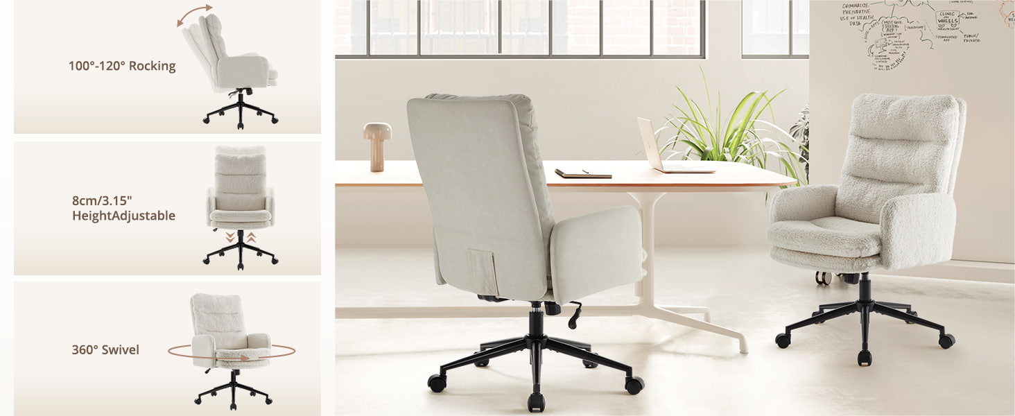 Denna kontorsstol i kashmir med hög rygg är designad för köpare som värdesätter premiumkomfort, modern estetik och ergonomiskt stöd. Stolen har en vadderad sits i två lager med figurbomull och högdensitetssvamp, och levererar molnliknande mjukhet samtidigt som den bibehåller ett stabilt stöd under långa sittpass. Det mjuka faux kashmirtyget ger en varm, hudvänlig touch, vilket gör den perfekt för hemmakontor, sovrum, sminkuppsättningar och moderna arbetsytor. Dess 360° svängbara bas, SGS-certifierade lyft, tysta hjul och 100°–120° gungfunktion gör den lämplig för produktivitet, avkoppling och daglig användning.