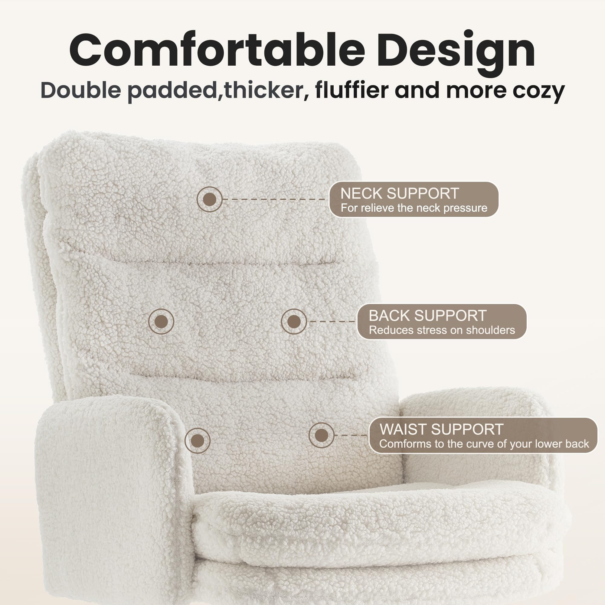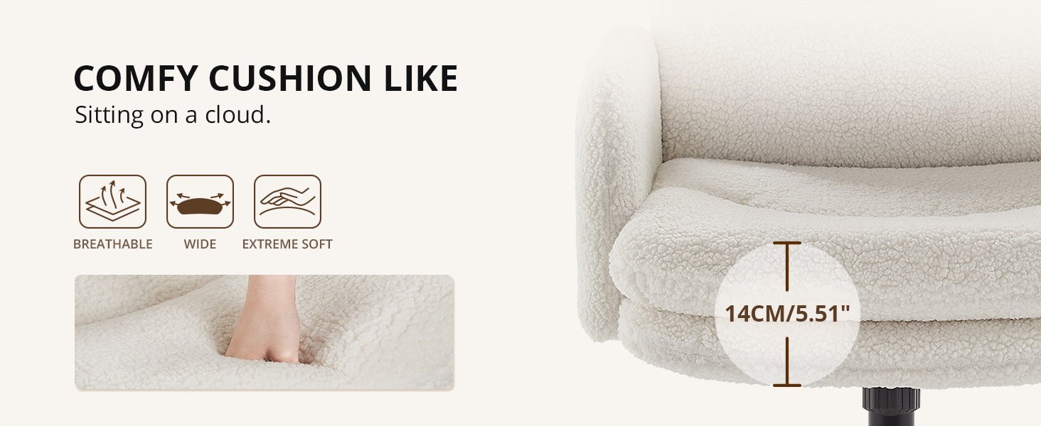 Kudden med två lager – med fluffig figurbomull och högdensitetssvamp – erbjuder en molnliknande sittupplevelse som förblir bekväm även under långa arbets- eller studiepass. Stolen har en 100°–120° gungfunktion, en 3,15" (8 cm) höjdjusterbar sits och 360° vridning, vilket ger dig full flexibilitet under hela dagen.