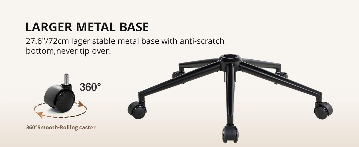 En bred 72 cm (28,35") metallbas säkerställer stabilitet, och de tysta nylonhjulen rullar smidigt utan att repa golvet. Den här stolen är perfekt för hemmakontor, arbetsrum, sovrum och smycken. Den här stolen blandar komfort, estetik och praktiska vardagliga funktioner.