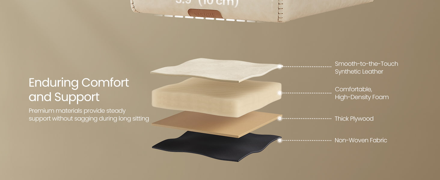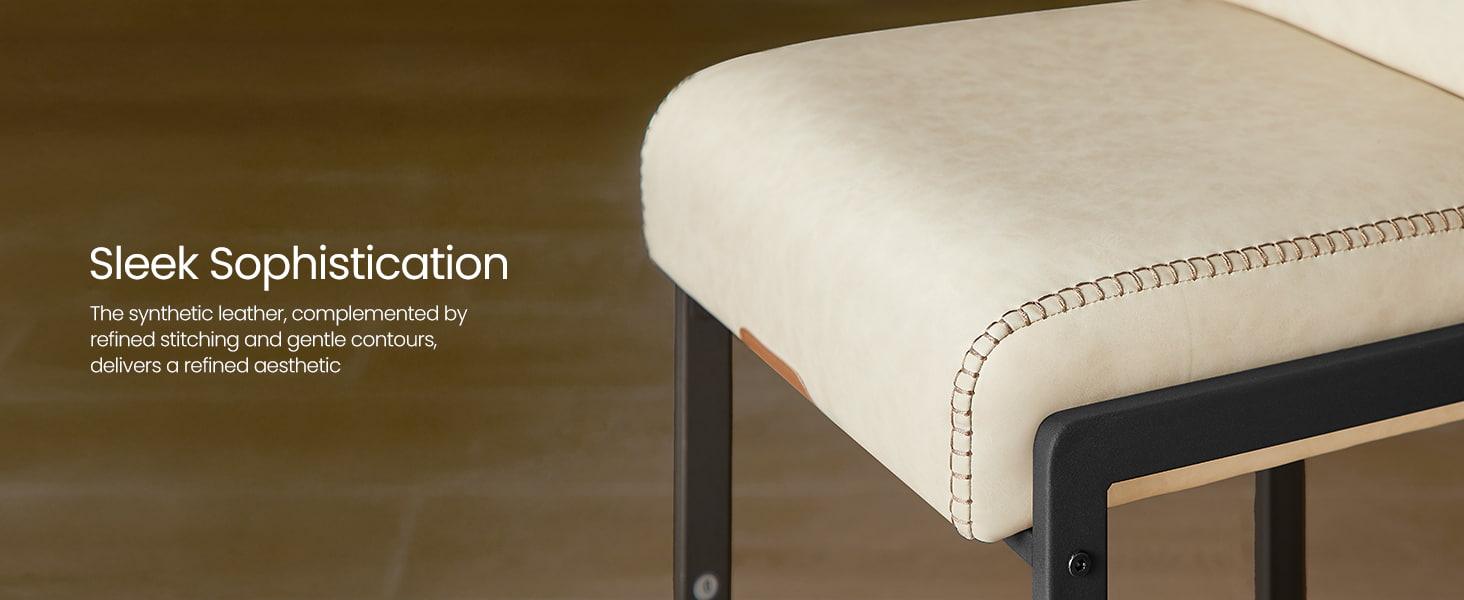 Den släta syntetiska läderytan är detaljerad med subtila sömmar, vilket ger en designad look samtidigt som den förblir lätt att underhålla – perfekt för livliga hushåll och lätta kommersiella miljöer. En mjukt böjd sitskant hjälper till att minska bentrycket, medan den integrerade bakfickan ger bekväm förvaring för telefoner, surfplattor eller småsaker. Den här barstolen stöds av en robust metallram med dolda justerbara fötter och säkerställer stabilitet på olika golvytor och anpassar sig utan ansträngning till moderna kök, matsalar eller avslappnade underhållningsområden.