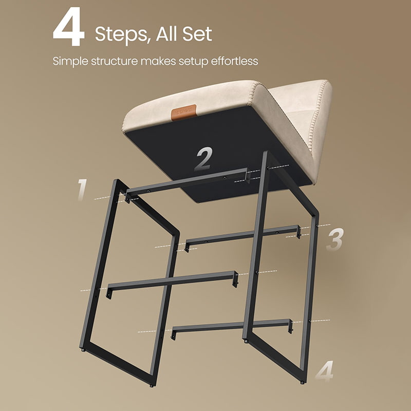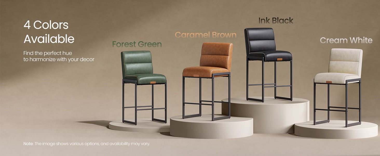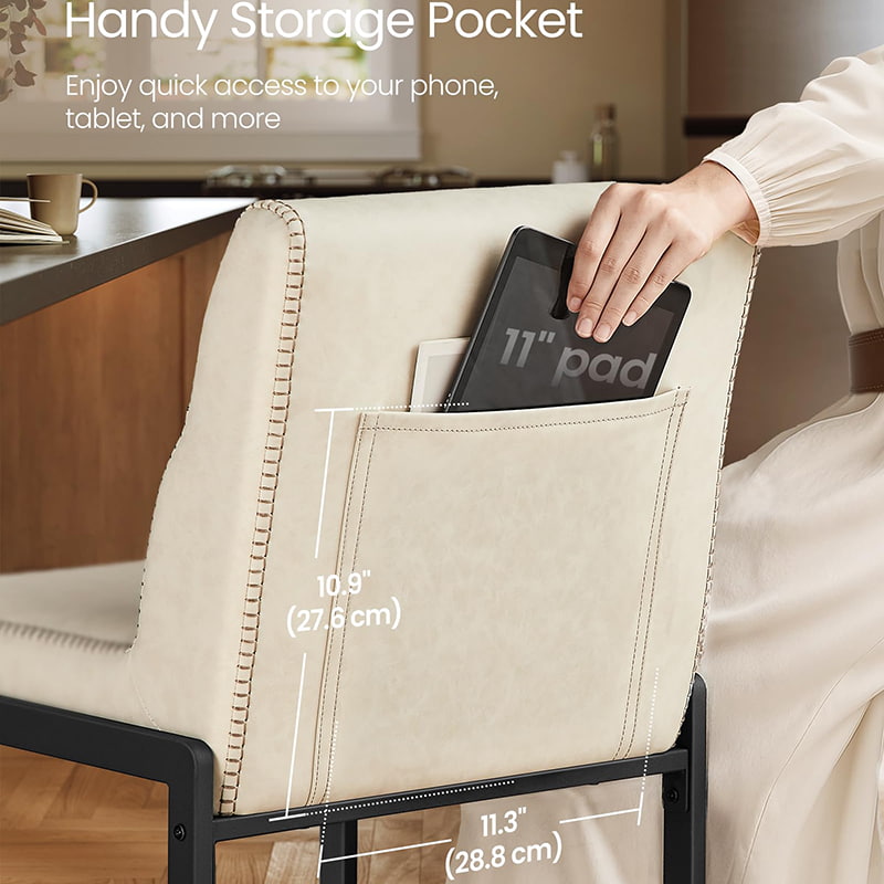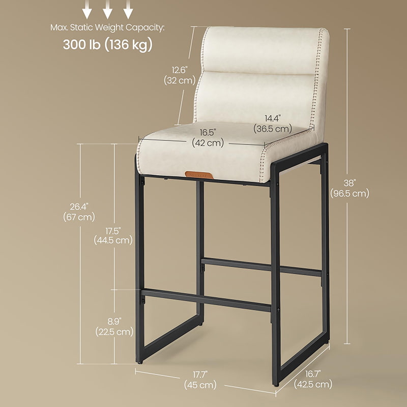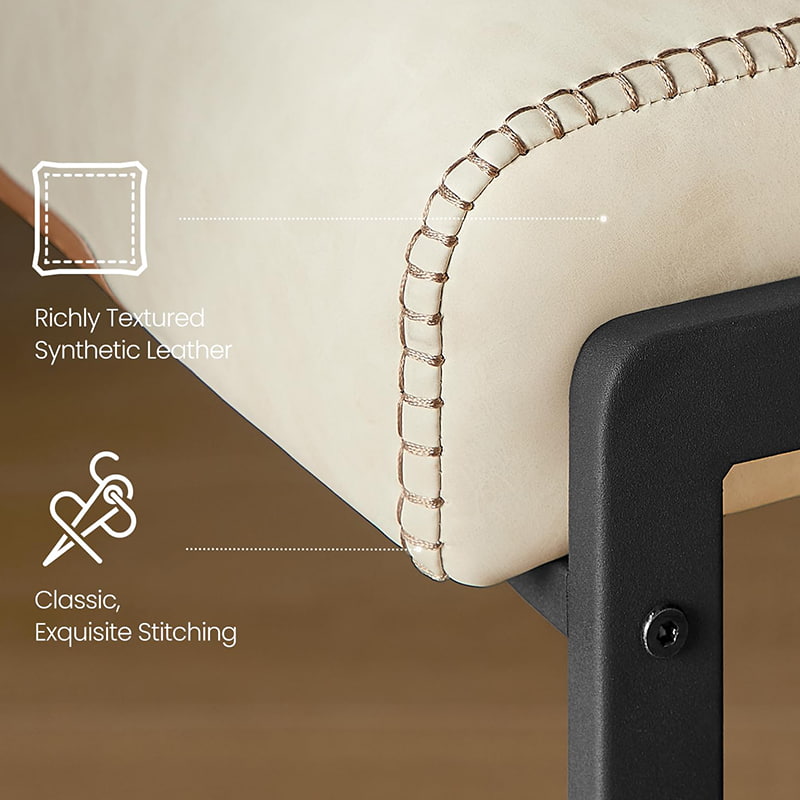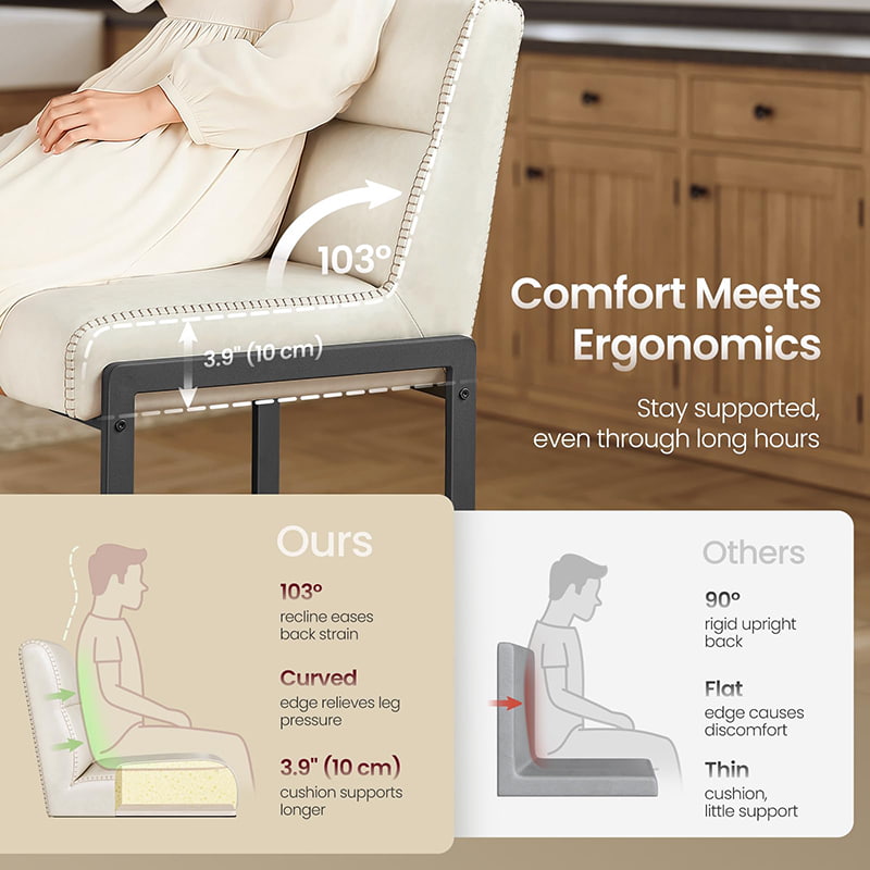 Moderna barstolar från mitten av århundradet designade för köksbänkar och matöar, dessa krämvita mothöjdsstolar har slitstark klädsel i syntetiskt läder med raffinerade sömmar och en ren arkitektonisk metallram. Det ergonomiska 103-graders segmenterade ryggstödet, 3,9-tums tjocka vadderade säte och böjda framkant ger varaktig komfort för långvarig sittning, vilket gör dem lämpliga för både bostadskök och lätta kommersiella miljöer som kaféer eller utställningslokaler.