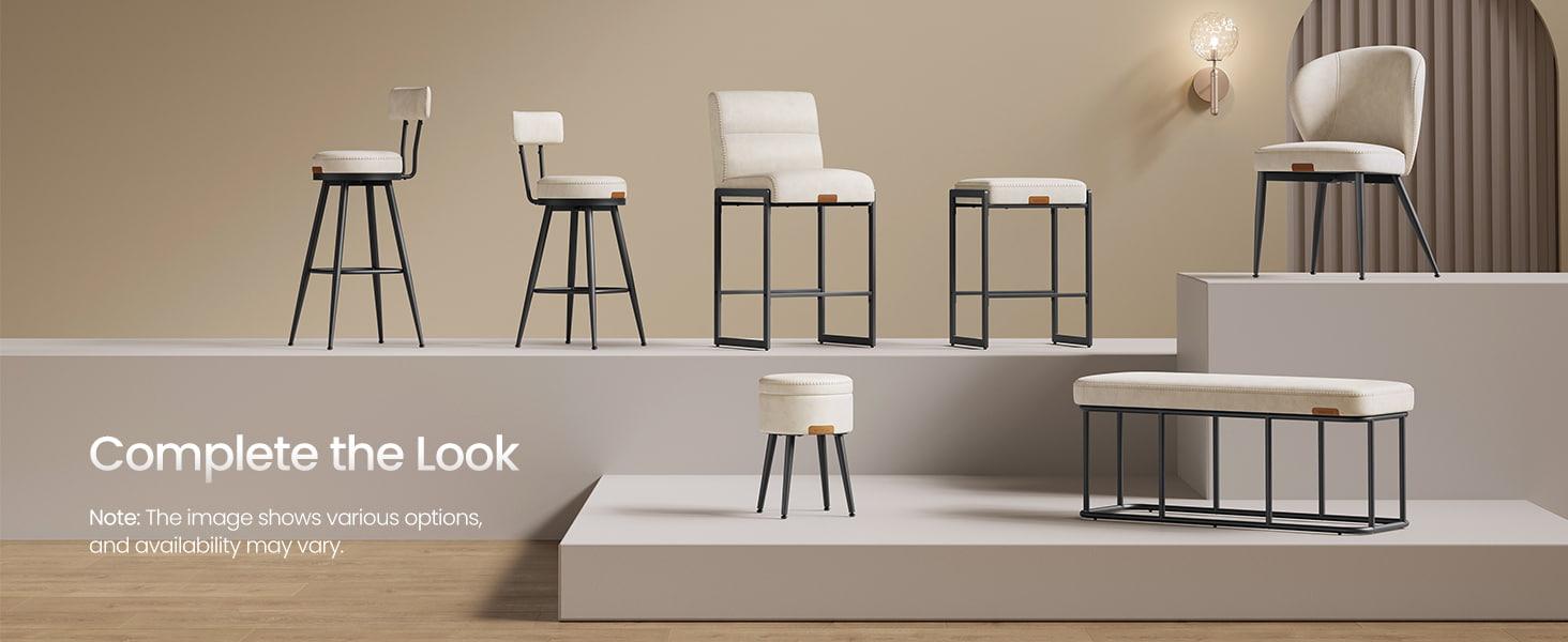 lär dig merDenna moderna barstol från mitten av århundradet kombinerar rena metallstrukturer med mjuk krämvit syntetläderklädsel för en raffinerad men ändå praktisk sittlösning. Designad för köksöar och matsalsbänkar, har stolen en generöst vadderad sits och ett segmenterat ryggstöd som är vinklat i 103°, vilket ger balanserat ergonomiskt stöd för dagligt bruk.