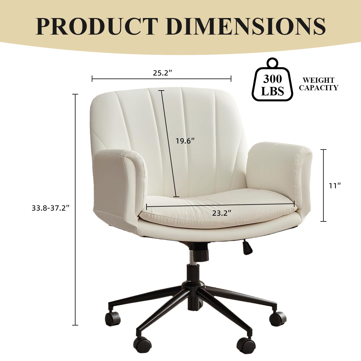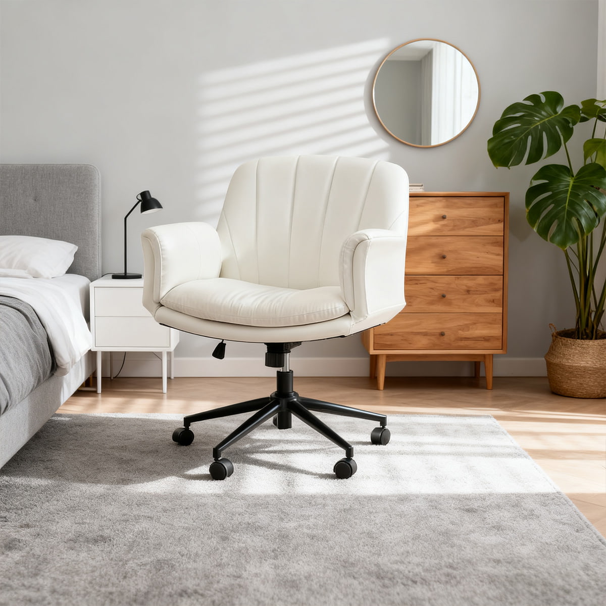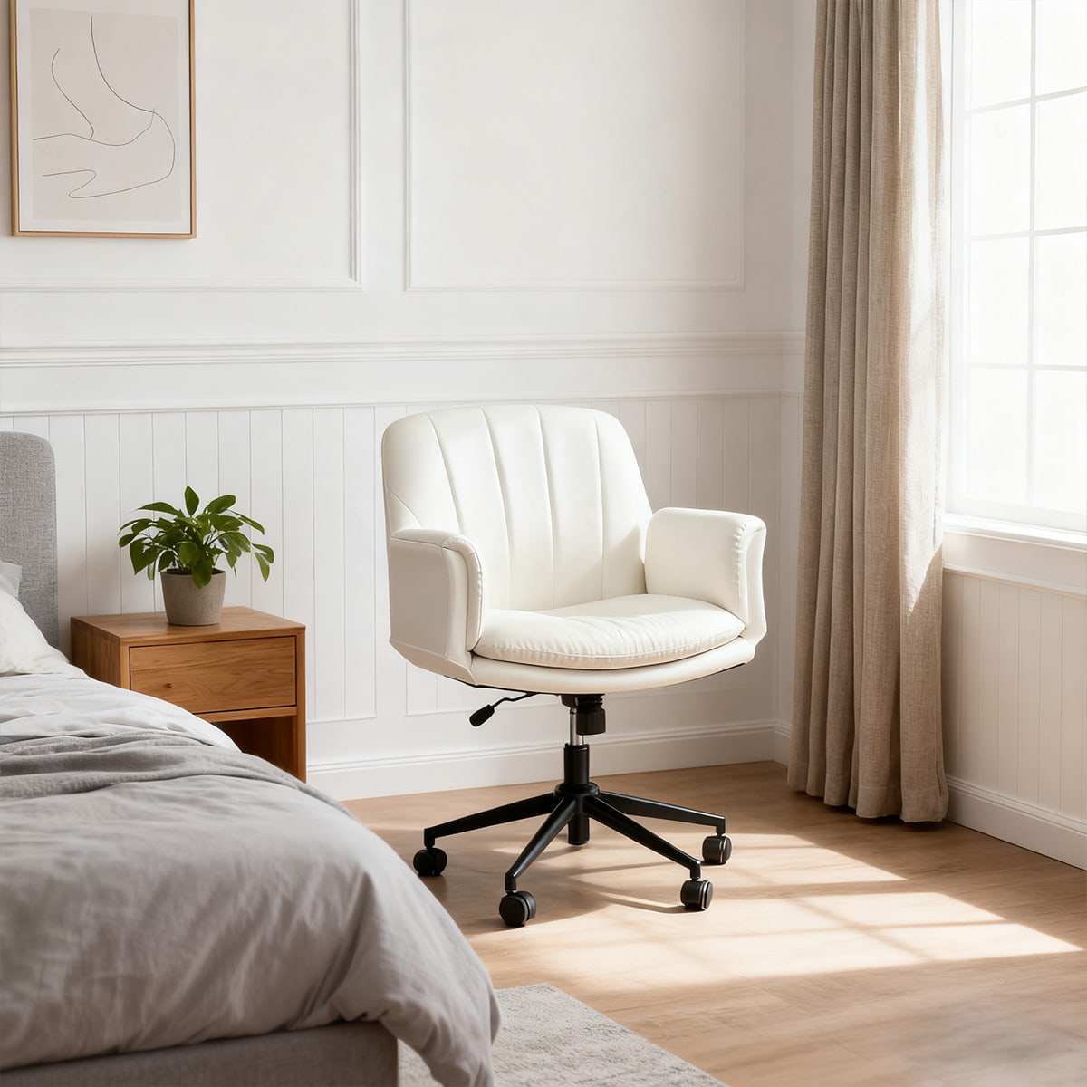 Criss Cross justerbar PU-läderstol med 5-växlade armstöd och hjul——Ergonomisk fåfänga/kontors-/sminkstol (Mjölkvit)