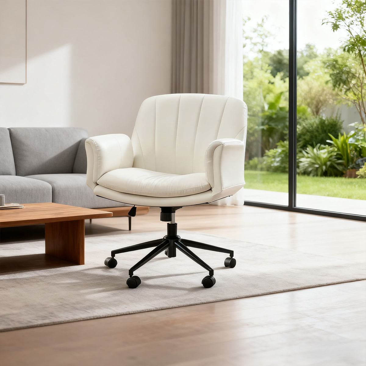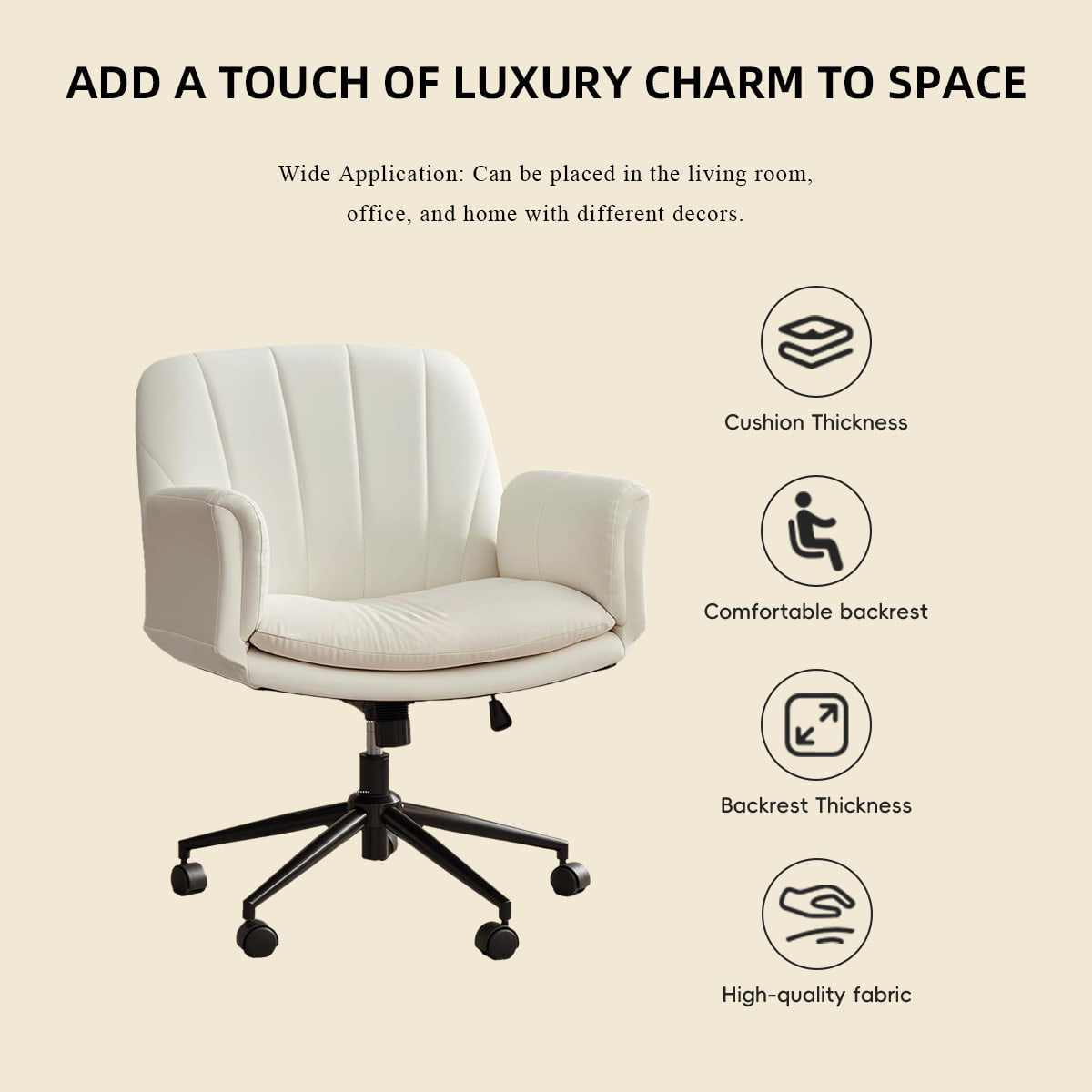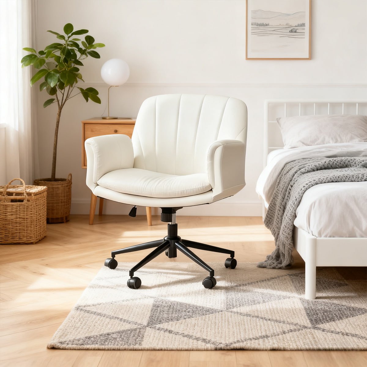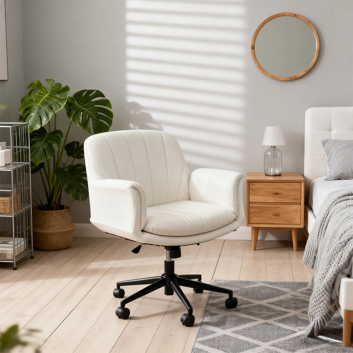 Criss Cross justerbar PU-läderstol med 5-växlade armstöd och hjul——Ergonomisk fåfänga/kontors-/sminkstol (Mjölkvit)